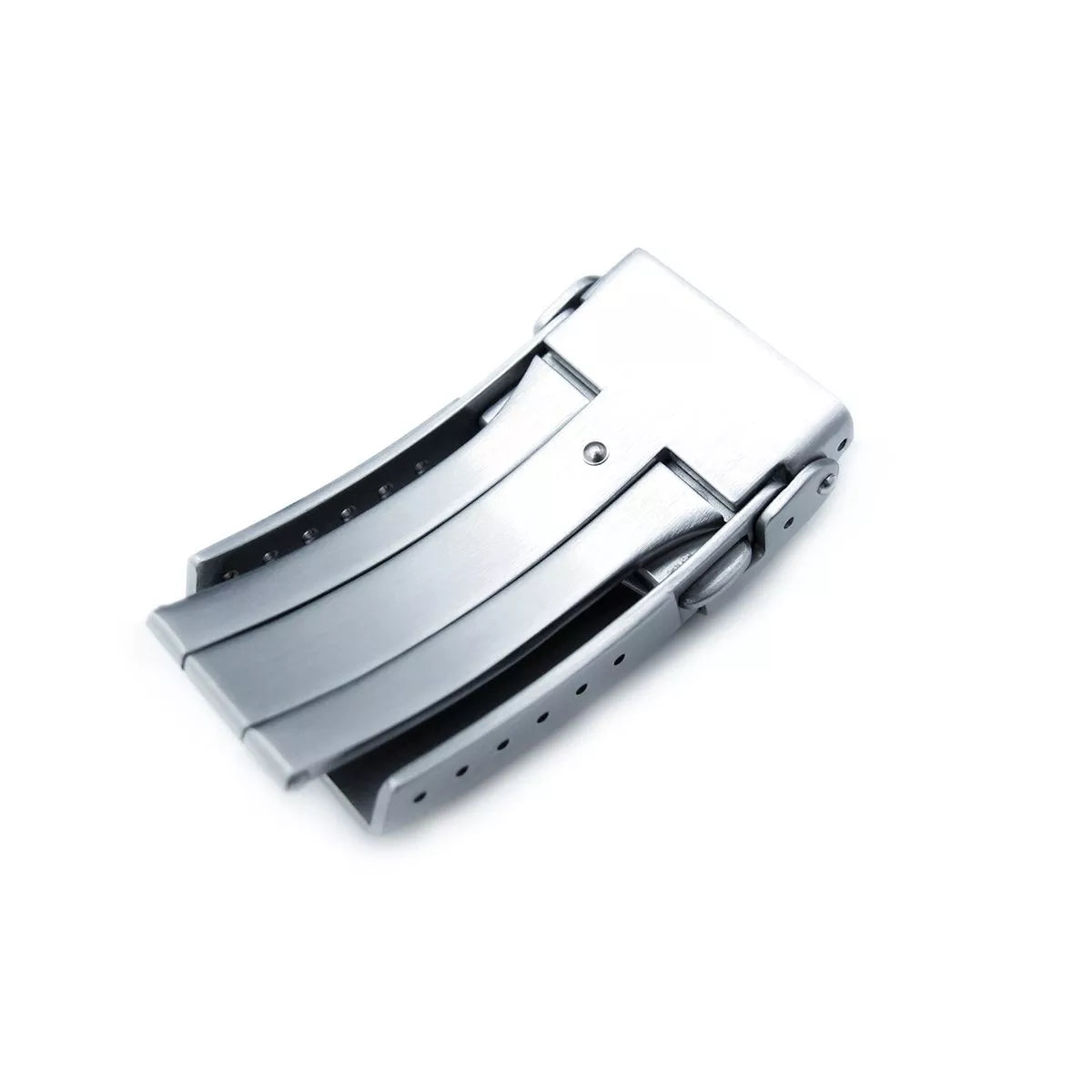 This diver's clasp features a V-style double-lock button and is crafted from robust 316L stainless steel. Equipped with six micro holes, it allows precise length adjustments. The clasp boasts a V-shaped safety lock and a chamfer-edged design, providing a polished and refined appearance.